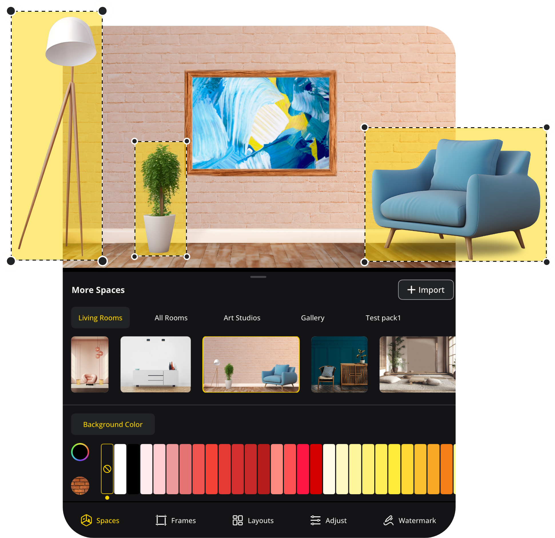 With hundreds of customizable interiors and smart tools, you can stage your artwork in lifelike settings, build a stunning portfolio, and impress clients or collectors. Whether you’re sharing on social media or preparing for a sale, Art Space makes it simple to create professional art mockups in minutes.
